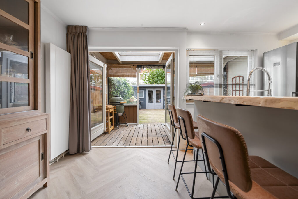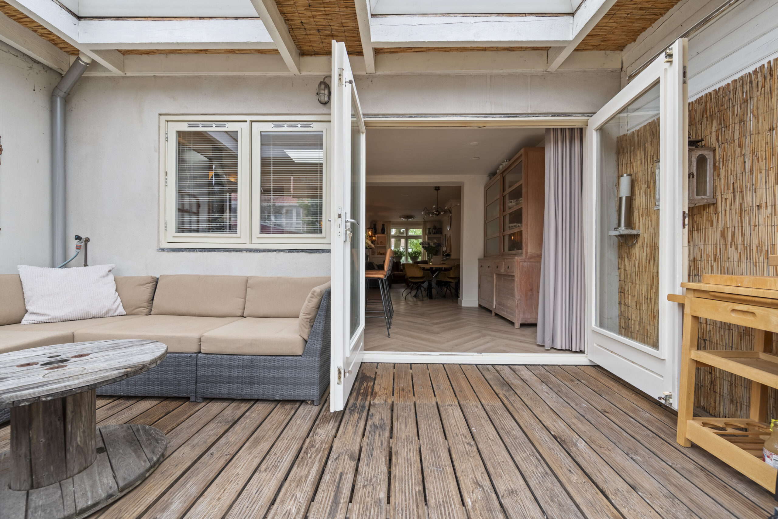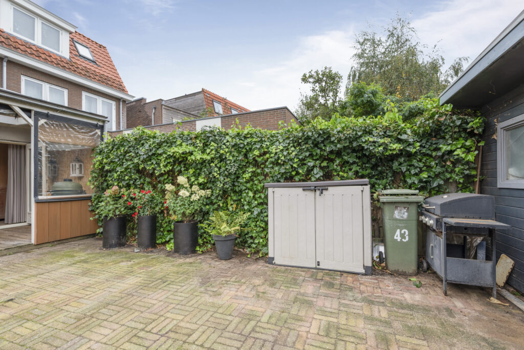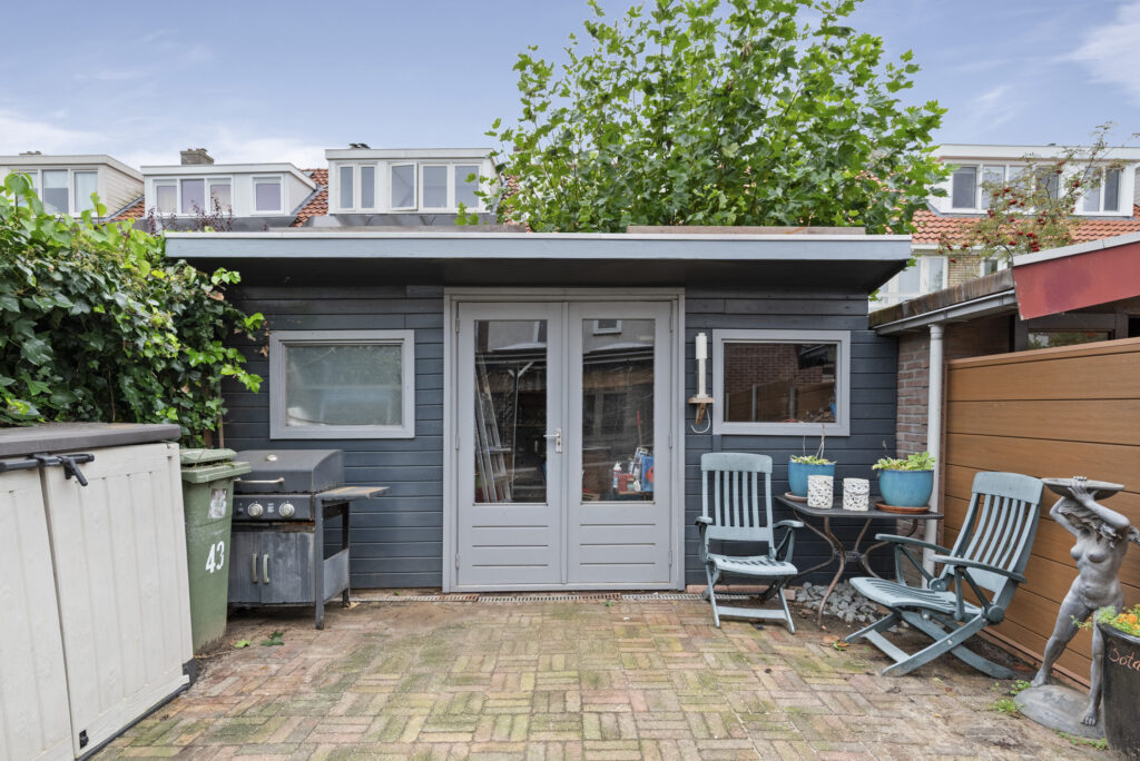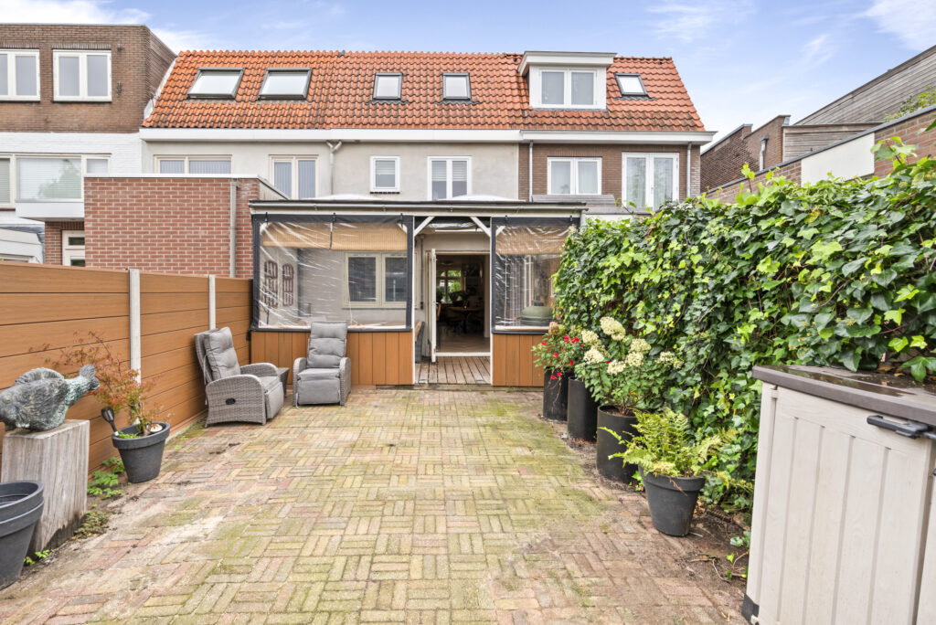 De diepe achtertuin ligt op het westen, waardoor je hier heerlijk van de middag- en avondzon kunt genieten. De gezellige veranda biedt een knus plekje om het hele jaar door van het buitenleven te profiteren. Achter in de tuin staat een grote schuur met achterom – ideaal voor fietsen, opslag of hobby’s.