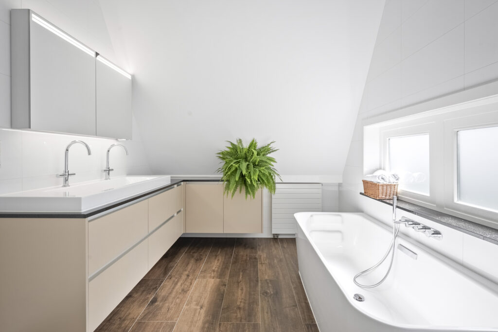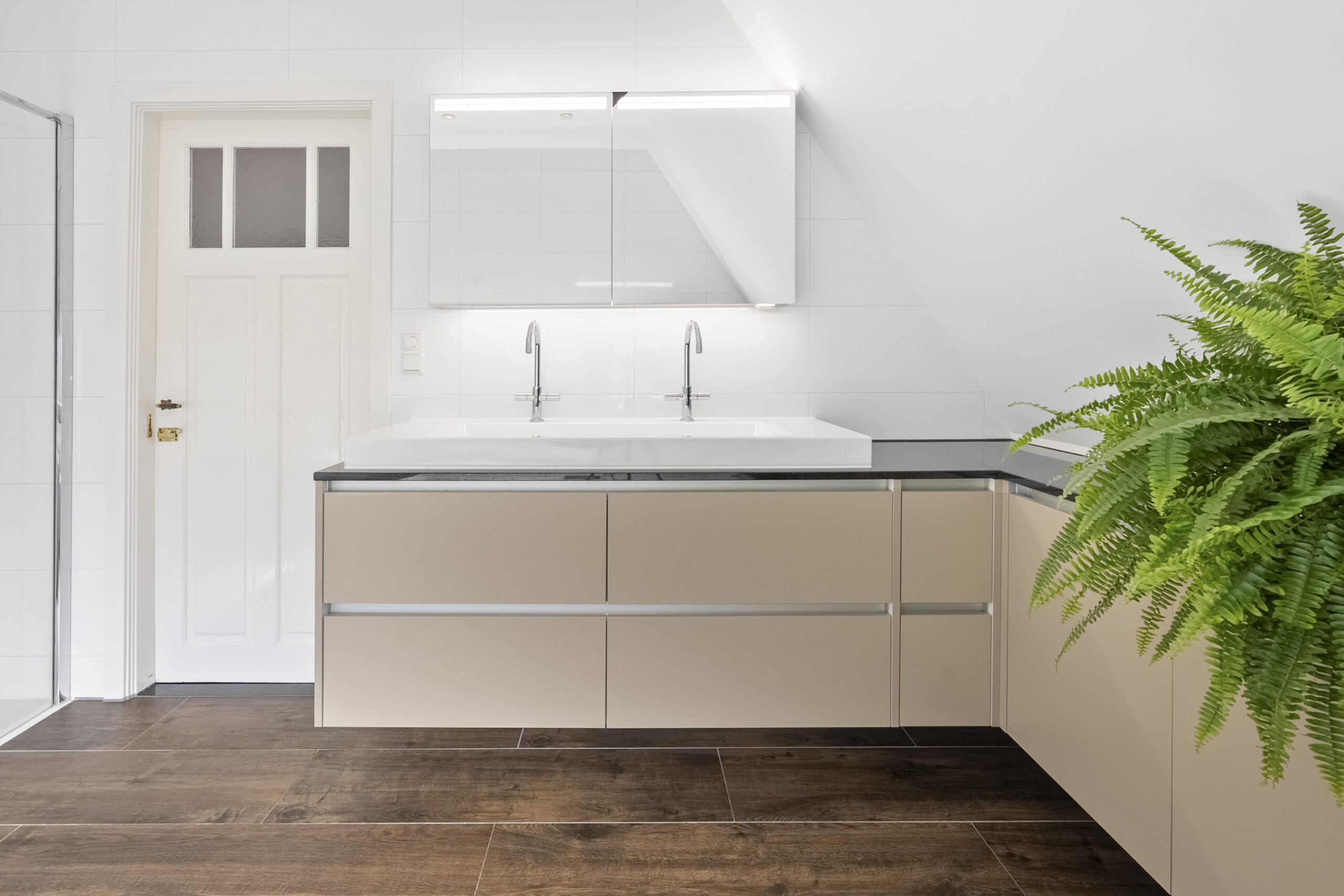 Via the bright hall with staircase, wooden balustrade and beautiful stained glass windows, you reach the first floor landing. Here you will find 2 very spacious bedrooms, a smaller bedroom and the luxury bathroom. This is equipped with a large washbasin unit, bathtub, walk-in shower and a second toilet.