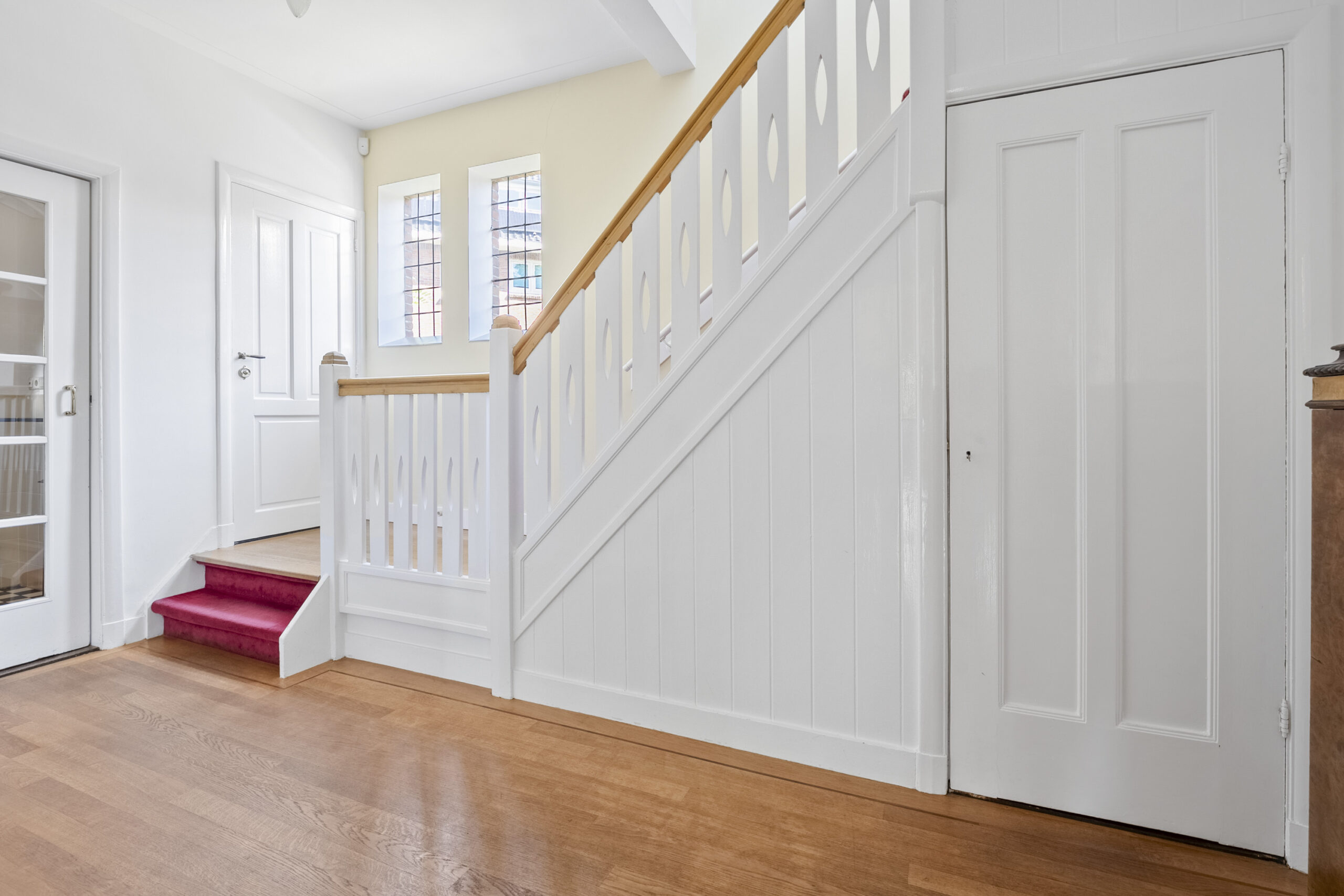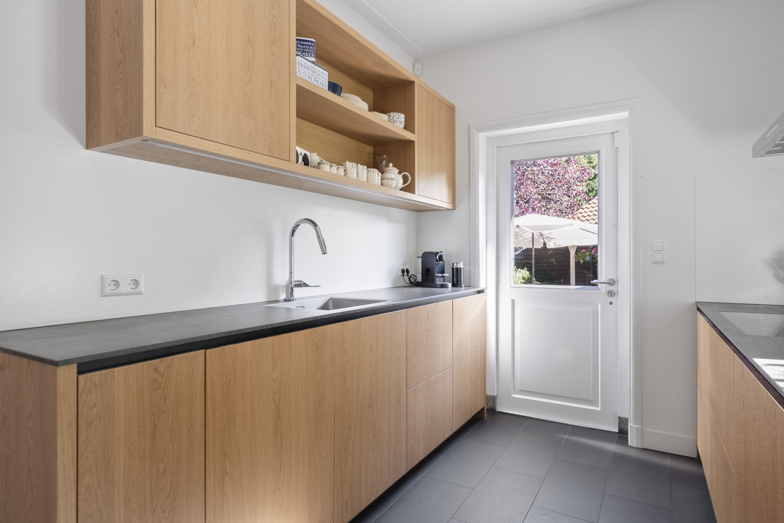 The atmospheric dining room is spacious and has a bay window and a decorative fireplace with tiles in the style of William Morris. Through double glass doors you walk into the sitting room. From both rooms there is a beautiful view of the surrounding garden where you can enjoy all seasons throughout the year. The beautiful oak bespoke kitchen from 2022 is the perfect place to prepare a delicious dinner. The layout is ideal, with the sink and worktop on one side and the induction hob on the other. The well-organised wall of cabinets contains two fridge/freezer combinations and two ovens, with plenty of storage space.