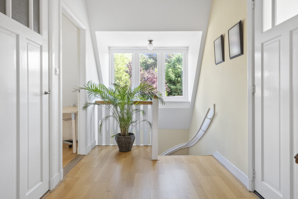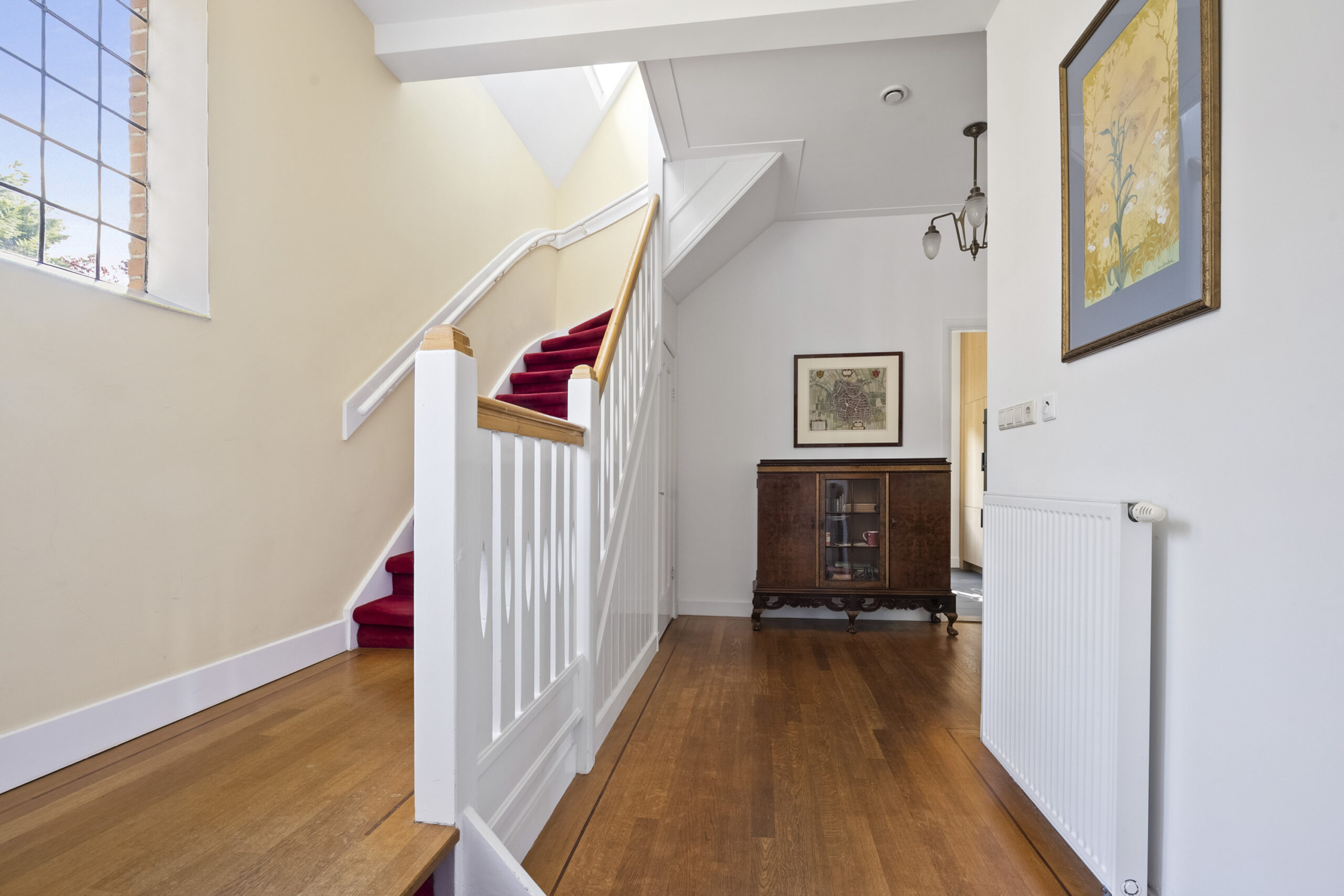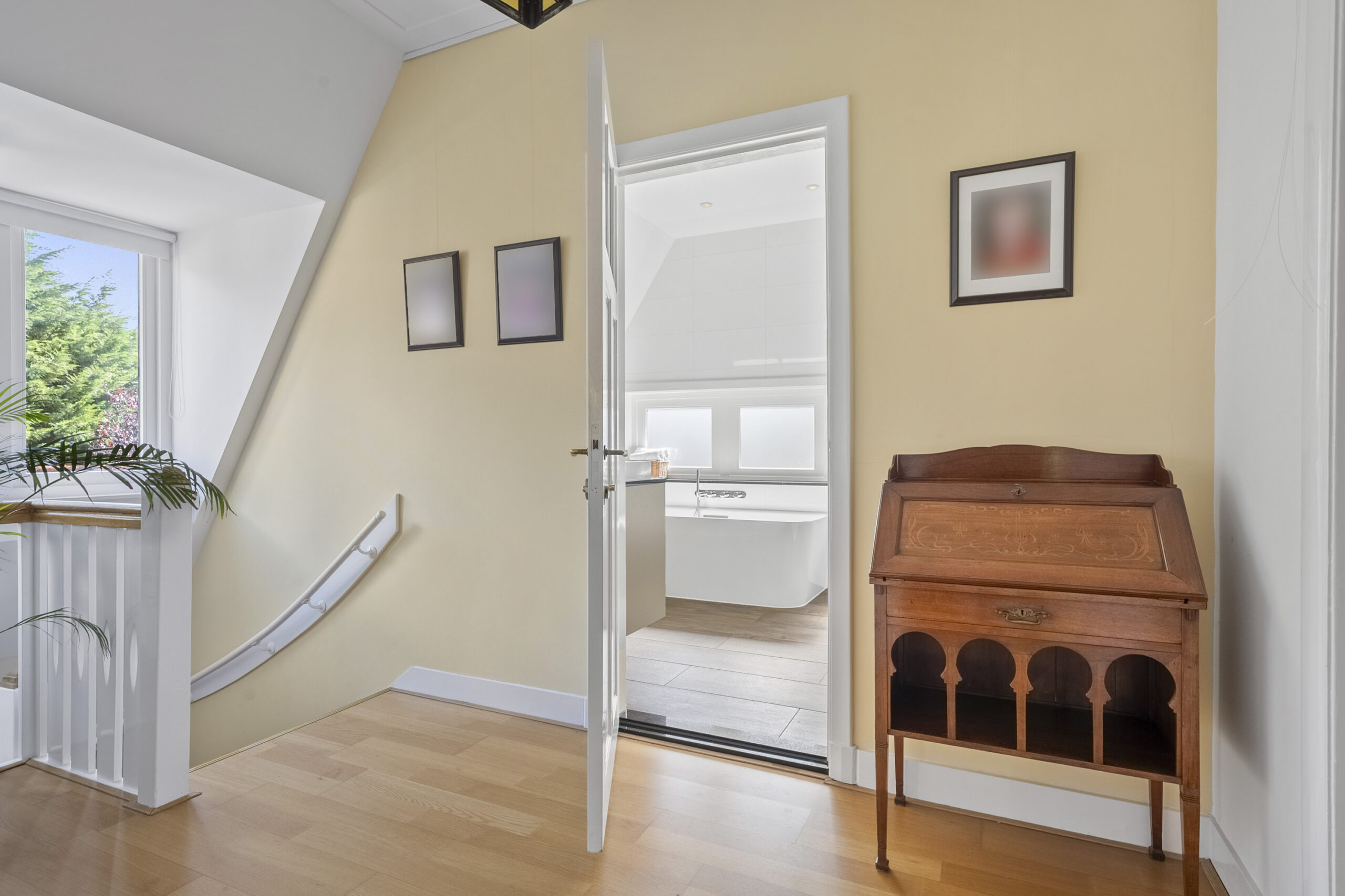 Via de sfeervolle lichte hal met bordestrap, houten balustrade en fraaie glas-in-lood ramen, bereik je de overloop van de eerste verdieping. Hieraan liggen 2 zeer ruime slaapkamers, een kleinere slaapkamer en de luxe badkamer. Deze is voorzien van een royaal wastafelmeubel, ligbad, inloopdouche en tweede toilet.