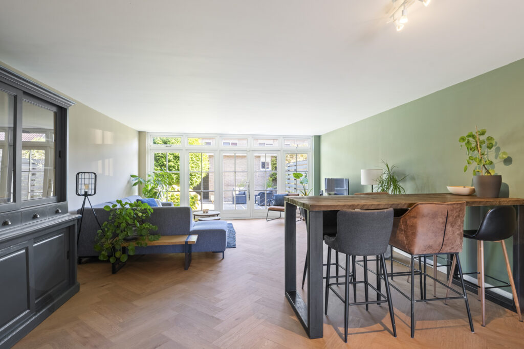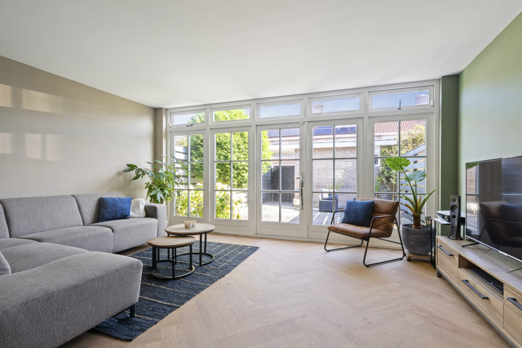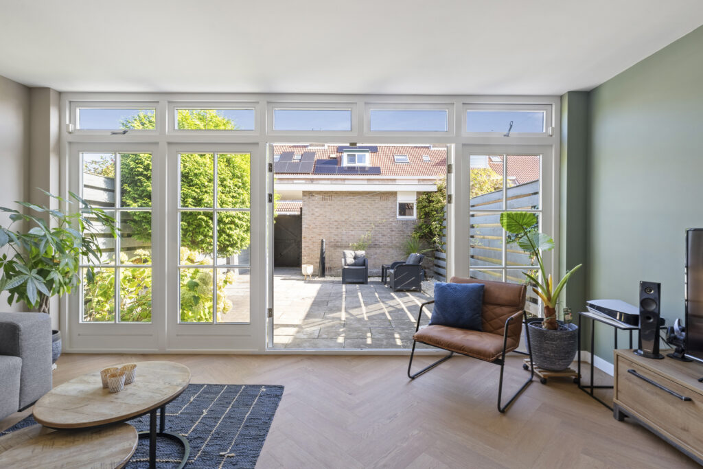 • Lichte woonkamer met grote raampartijen en openslaande deuren naar de tuin