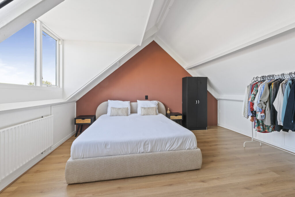 De zolderverdieping is verrassend ruim dankzij de dakkapel en beschikt over veel bergruimte achter de knieschotten. Hier vind je ook de aansluiting voor de wasmachine. Deze verdieping biedt de mogelijkheid om eenvoudig af te sluiten met een wand en deur, waardoor er een volwaardige extra slaapkamer kan worden gecreëerd.